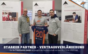 Es ist ja schon lange kein Geheimnis mehr, dass die S + T Fassaden GmbH und die Griffins strategische Partner sind. Umso erfreulicher, dass mit dem Familienunternehmen mit Stammsitz in Tessin ein weiterer mittelständischer Unternehmer und großer Arbeitgeber in der Region den Weg weiter mit den Hansestädtern geht. Dazu sind die Geschäftsführer Herr Bernd Schröter, der auch dem Griffins Wirtschaftsbeirat vorsteht, und Stefan Karnatz nicht nur Griffins- sondern auch echte NFL Fans und hatten zur Vertragsunterzeichnung entsprechend ihrer Lieblingsteams Flagge gezeigt.