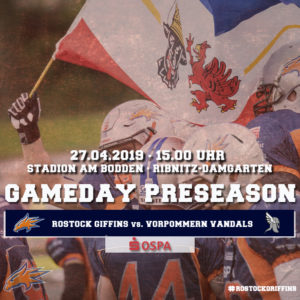 Das zweite Peaseason Game zur Saison 2019 findet am 27.04.2019 statt und die Greifen wollen sich bei den vielen Fans aus Vorpommern bedanken. Dank der Kooperation mit der Stadt Ribnitz-Damgarten ist es uns gelungen, erstmalig im wunderschönen Stadion am Bodden spielen zu können. Gegner ist die Auswahl Vorpommerns, die Vorpommern Vandals !!!