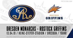 Sportdirektor Ronny Schmidt schaut dem Aufeinandertreffen der beiden Mannschaften erwartungsvoll entgegen: „Sportlich sind die Monarchs natürlich eine sehr harte Nuss, aber mit solchen Spielen werden wir besser. Zudem spielen die Dresdener einen sauberen Football und sind professionell geführt, beste Bedingungen für ein Testspiel also.“ Die Griffins ihrerseits befinden sich seit Anfang März auf ihrem Trainingsgelände in Warnemünde in der Saisonvorbereitung, seit zwei Wochen sind nun auch alle internationalen Spieler in Rostock eingetroffen und werden in die Mannschaft integriert. Manager Jens Putzier ist mit dem bisherigen Verlauf der Pre-Season zufrieden: „Das Team hat in den letzten Wochen wirklich eine hervorragende Trainingsbeteiligung gezeigt und arbeitet sehr fokussiert. Ich bin zuversichtlich, dass wir 2019 den nächsten Schritt machen und um die Tabellenspitze mitspielen können.“