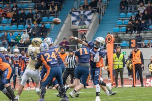 Natürlich war die Vorentscheidung zu diesem Zeitpunkt bereits gefallen, dennoch gaben beide Teams auch in der zweiten Halbzeit weiter Vollgas. Quarterback Michael Bensch, der seit Mitte des zweiten Viertels die Geschicke der Offensive lenkte, bediente Eric Rhode mit einem wunderbaren Touchdown-Pass und RB Julian Hagen, der erst vor dieser Saison von den Vandals zu den Griffins gewechselt war, konnte sich mit einem 48 Yard-Lauf in die Scorerlisten eintragen.